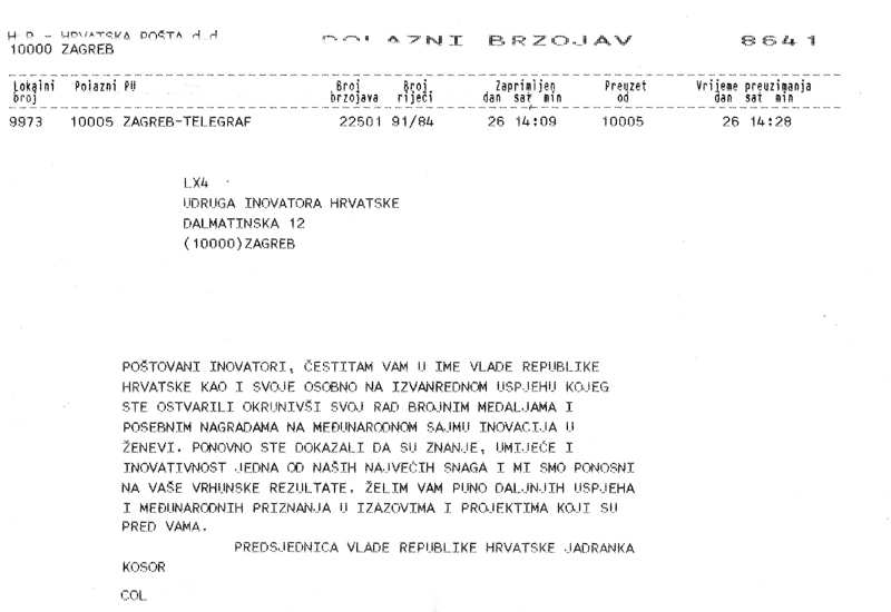 Brzojav premijerke Udruzi Inovatora Hrvatske