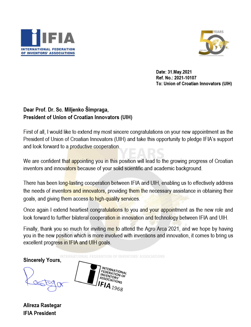 Čestitka za imenovanje novog predsjednika Udruge inovatora Hrvatske prof, dr. sc Miljenka Šimprage od strane IFIA (Međunarodne federacije nacionalnih saveza inovatora)