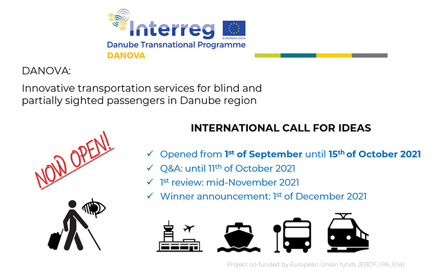 Interreg projekt “DANOVA: Inovativne usluge prijevoza slijepih i slabovidnih putnika u Dunavskoj regiji” je transnacionalni projekt suradnje koji sufinanciraju ERDF, IPA i ENI (fondovi Europske unije). Glavni je cilj projekta poboljšati pristupačnost zračnih i pomorskih luka, te autobusnih i željezničkih stanica za slijepe i slabovidne putnike. Cilj se planira postići razvojem novih usluga i kompetencija koje bi slijepim i slabovidnim osobama omogućile potpuni pristup svim prijevoznim infrastrukturama, informacijama i uslugama. Stoga vas partnerstvo moli da putem slanja svojih prijava na Poziv za ideje obogatite naša znanja o novim rješenjima koja mogu učiniti prijevozne sustave pristupačnijima slijepim i slabovidnim osobama.