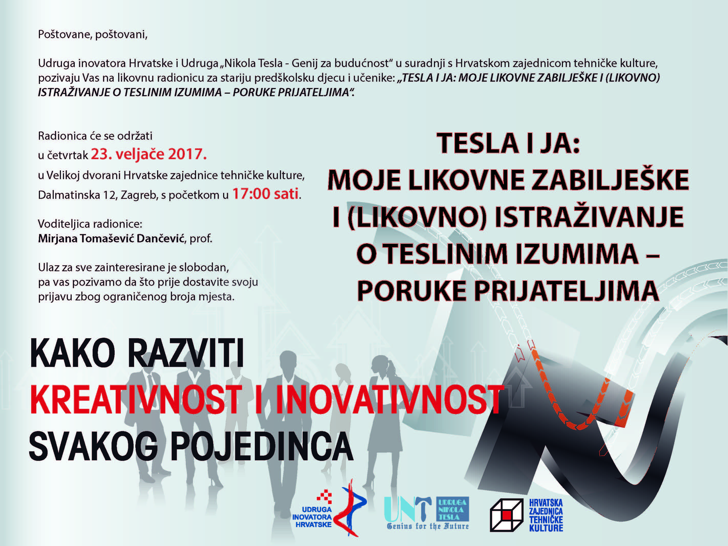 Drugo predavanje- radionica u 2017. godini iz ciklusa predavanja koje organiziraju Udruga Nikola Tesla – genij za budućnost i Udruga inovatora Hrvatske u suradnji s Hrvatskom zajednicom tehničke kulture s ciljem poticanja kreativnosti i inovativnosti kod osoba svih životnih dobi u sklopu projekta „Kako razviti kreativnost i inovativnost svakog pojedinca“. Zbog ograničenog broja sudionika do 25, prijave šaljite na e-mail: silvana.svilar@inovatorstvo.com