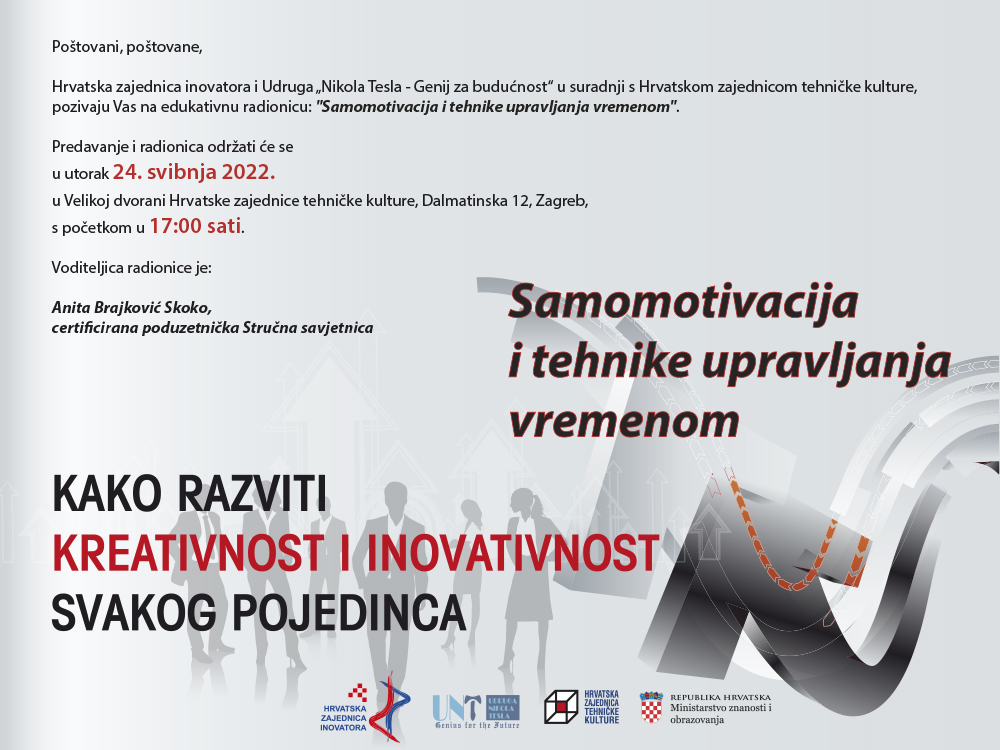 Zadnja u nizu edukativnih radionica koje je za 2022. godinu pripremila Udruga Nikola Tesla - Genij za budućnost u suradnji s Hrvatskom zajednicom inovatora održat će se u utorak, 24. svibnja u 17.00 sati u prostoru Hrvatske zajednice inovatora, Dalmatinska 12, na temu „Samomotivacija i tehnike upravljanja vremenom“.