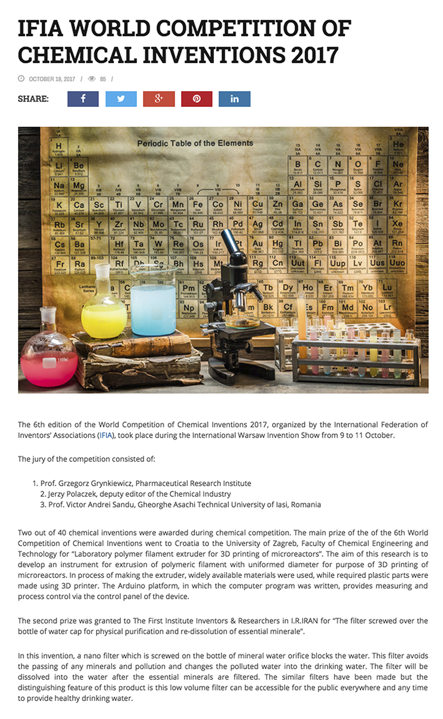IFIA, Natjecanje u izboru najbolje inovacije iz područja kemijskih znanosti za 2017. godinu. Dobre vijesti za hrvatske kemičare