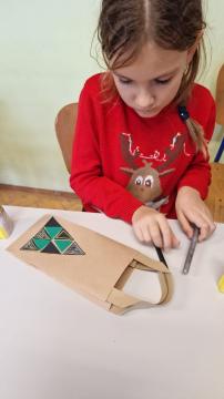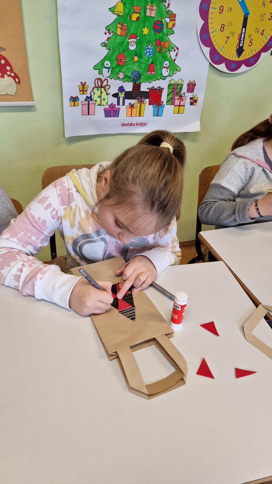 U nastavku radionice krenuli su u izradu svojih ukrasnih vrećica uz stručnu pomoć voditeljice i učiteljice Melite Damijanić. Nakon napravljene vrećice istu su ukrasili likovnim elementima (linijom , bojom i oblikom). Radionica je održana u ugodnom i kreativnom ozračju. Gotove vrećice učenici su ponijeli doma.