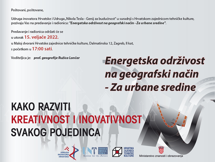 Najava edukativne radionice - Kako razviti kreativnost i inovativnost svakog pojedinca – inspirirani Nikolom Teslom - „Energetska održivost na geografski način - Za urbane sredine“, organizirati će se za učenike 1. Tehničke škole Tesla