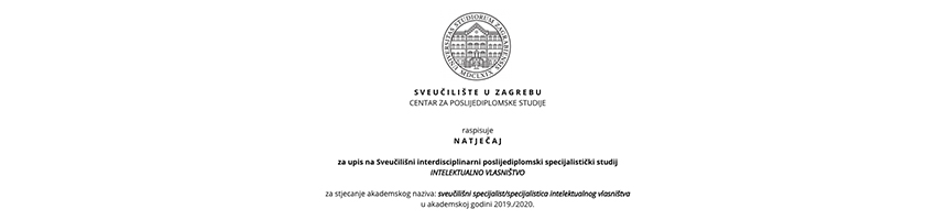 Temeljem Ugovora o poslovnoj suradnji sa Sveučilištem u Zagrebu obaviještavamo Vas da je otvoren Natječaj za upis na poslijediplomski sveučilišni interdisciplinarni specijalistički studij Intelektualno vlasništvo .