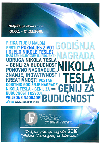 Dodjela Godišnje nagrade „Nikola Tesla -Genij za budućnost 2018" biti će održana 10. srpnja 2018. u Zagrebu na manifestaciji „Tesla & friends". Više na www.unt-genius.hr/projekti 2018.