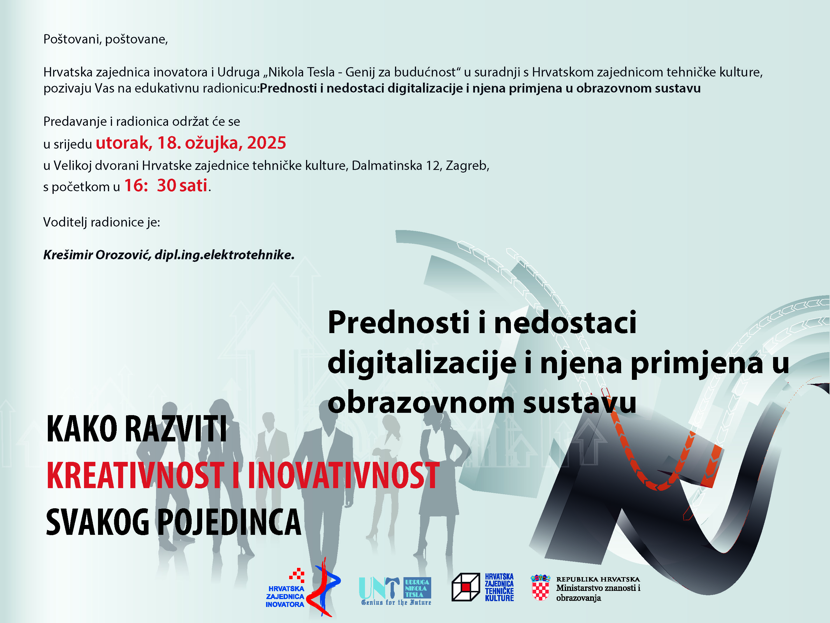 Druga edukativna radionica koju je za 2025. godinu pripremila Udruga Nikola Tesla – Genij za budućnost i Hrvatska zajednica inovatora u suradnji s Hrvatskom zajednicom tehničke kulture, održat će se utorak, 18. ožujka, 2025. u 16:30 sati na adresi Dalmatinska ulica 12, Zagreb.