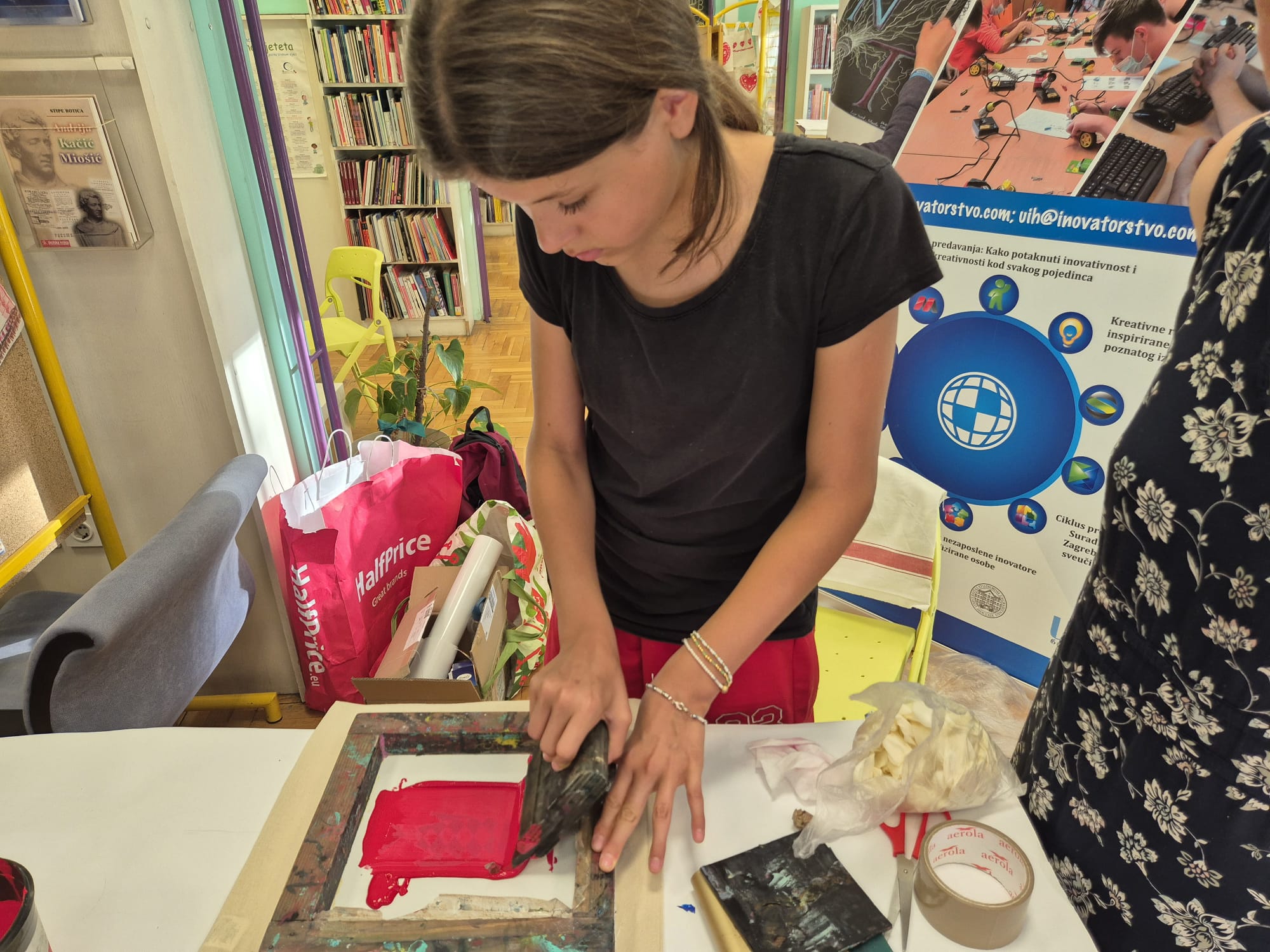 Polaznici su nanijeli boju na sito, a zatim ravnomjerno razmazali boju što je rezultiralo prenošenjem boje kroz otvorene dijelove sita na njihove već izrađene torbe i kuhinjske krpe. Svi polaznici su tako napravili unikatne torbe i kuhinjske krpe. Svi su bili izuzetno sretni i oduševljeni sa svojim radovima koje su mogli ponijeti kući.