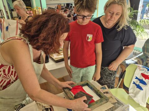 Kroz uvodno predavanje voditeljice radionice što je Sitotisak na platnu posjetitelji su saznali da se radi o tehnici tiska gdje se boja protiskuje kroz mrežasto sito na platno kako bi se dobio željeni uzorak. Objasnila je i što je sito: Sito je okvir obložen finom mrežicom na koji je prethodno izrađena šablona. Za ovu radionicu je prethodno izrađena šablona s motivom ribe u različitim veličinama i bojama.