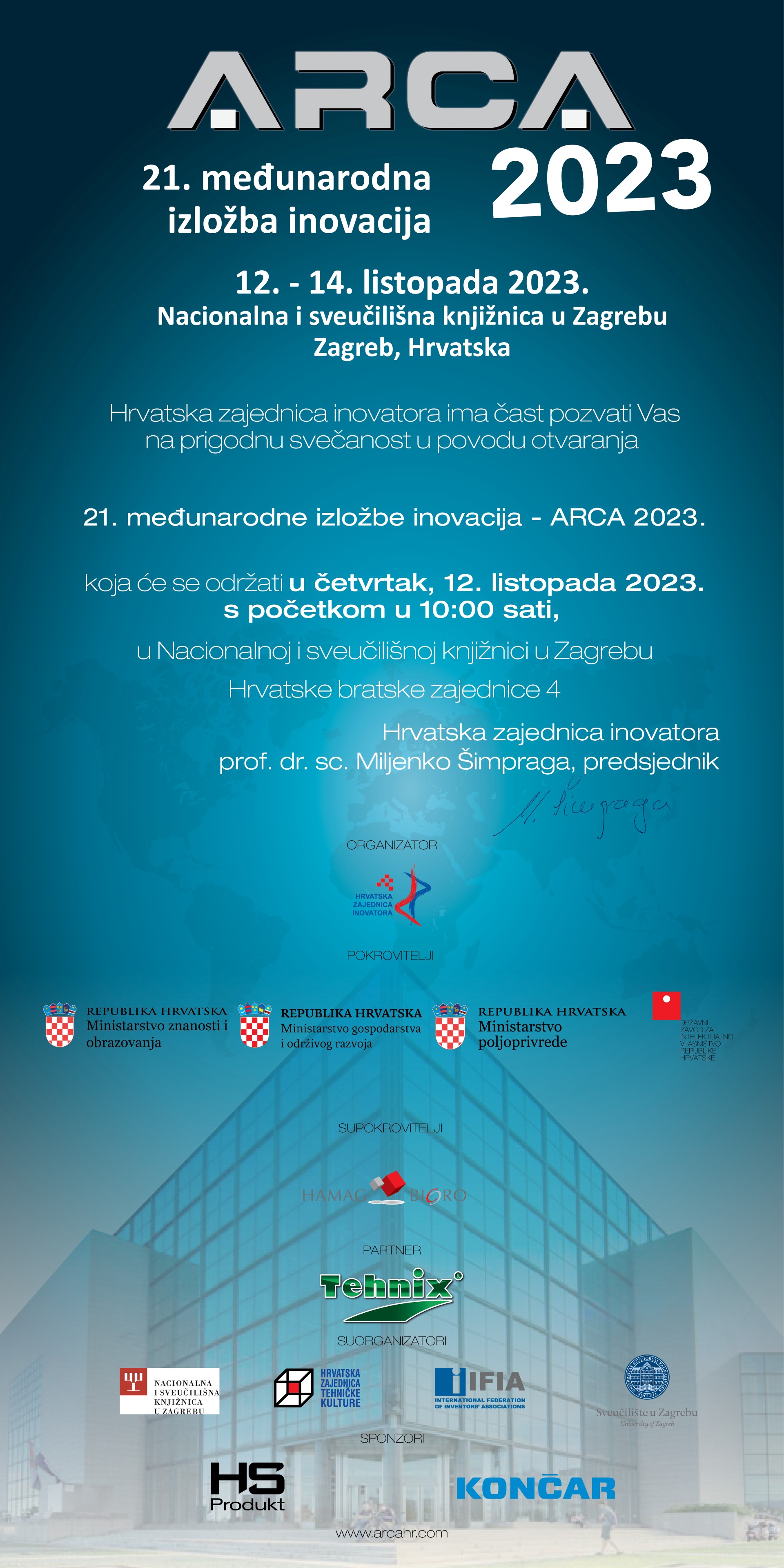 pozivamo Vas na svečano otvorenje 21. međunarodne izložbe inovacija ARCA 2023. koje će se održati u četvrtak 12. listopada 2023. u Nacionalnoj i sveučilišnoj knjižnici u Zagrebu s početkom u 10:00 sati.