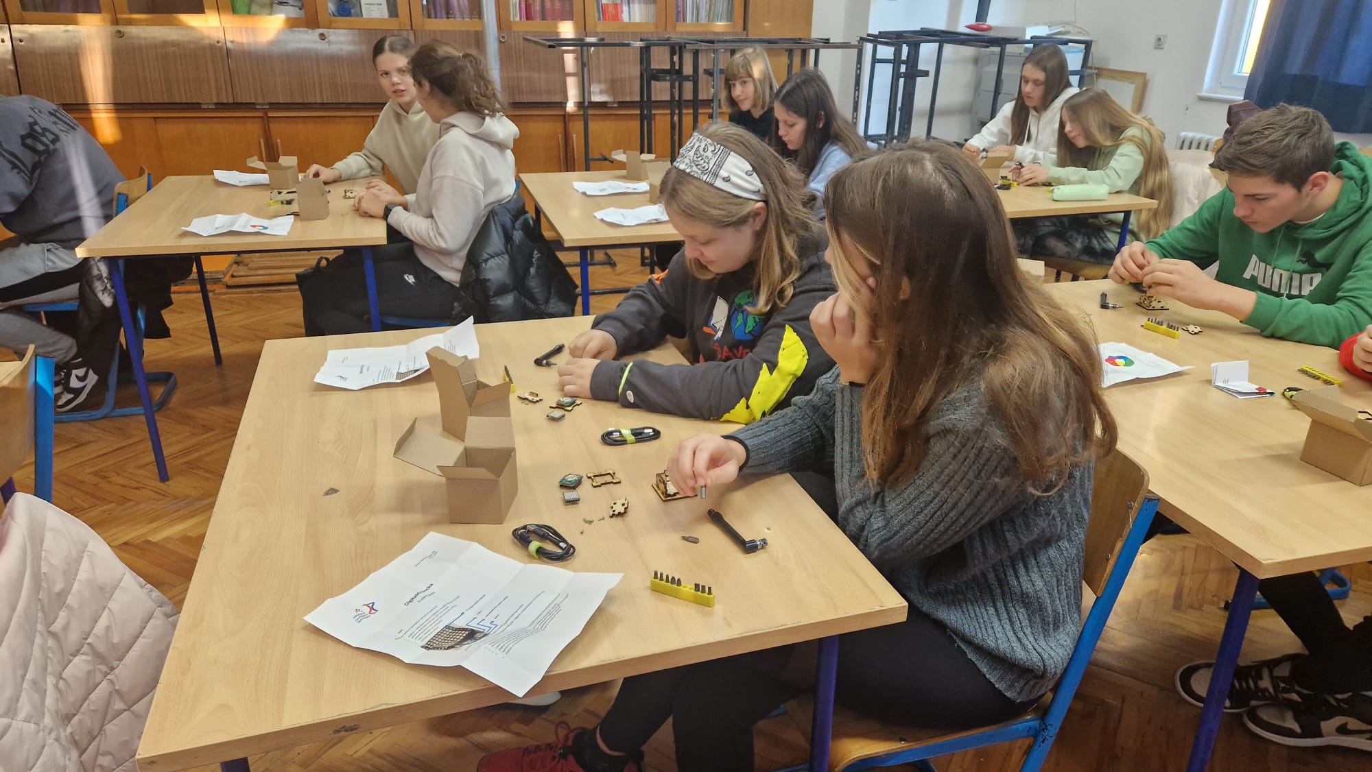 U OŠ u Kanfanaru smo održali radionicu: Digitalna kocka za učenike 8 razreda. Digitalna kocka je edukativni set koji se sastoji od: pločice s mikrokontrolerom , pločice s 8x8  s matricom LED-ica, piezoelektričnim elementom kao senzorom, USB kabelom za napajanje i kućištem.  Radionica je pogodna za finu motoriku ruku. Uz učenike radionicu je pratila i njihova učiteljica Barbara Šaina Šaponja. Sve radionice održane su uz pozitivnu evaluaciju.