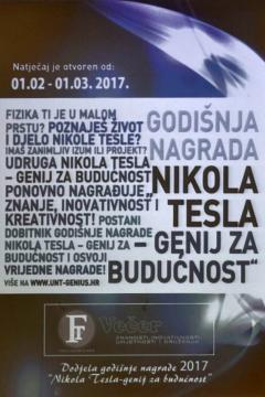 Nagrada Nikola Tesla – Genij za budućnost bit će dodijeljena 10. srpnja u Hotelu Esplanade u Zagrebu na manifestaciji obilježavanja obljetnice rođenja Nikole Tesle „Tesla&Friends“. Svi zainteresirani prijaviti se mogu do 1. ožujka ove godine.