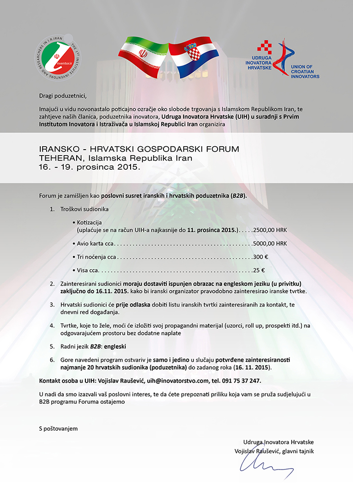 POZIV PODUZETNICIMA ZA SUDJELOVANJE NA IRANSKO-HRVATSKOM GOSPODARSKOM FORUMU, TEHERAN, IR IRAN, 16. - 19. prosinca 2015.