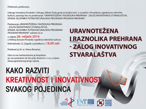 „Uravnotežena i raznolika prehrana - zalog inovativnog stvaralaštva“. Predavanje će u srijedu 26. veljače u Velikoj dvorani Hrvatske zajednice tehničke