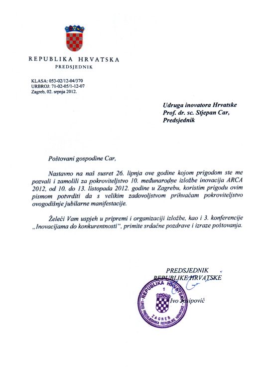 Predsjednik Republike Hrvatske dr. Ivo Josipović prihvatio visoko pokroviteljstvo nad 10. međunarodnom izložbom inovacija ARCA 2012.