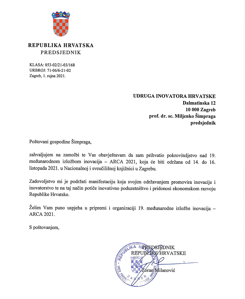 Predsjednik Republike Hrvatske pokrovitelj Međunarodne izložbe inovacija ARCA 2021.