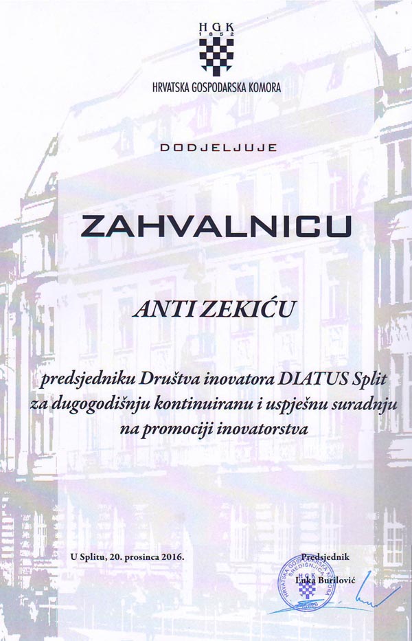 Na istoj sjednici g. ANTI ZEKIĆU, predsjedniku Društva inovatora DIATUS iz Splita, uručeno je posebno priznanje Hrvatske gospodarske komore - ZAHVALNICA za dugogodišnju kontinuiranu i uspješnu suradnju na promociji inovatorstva.