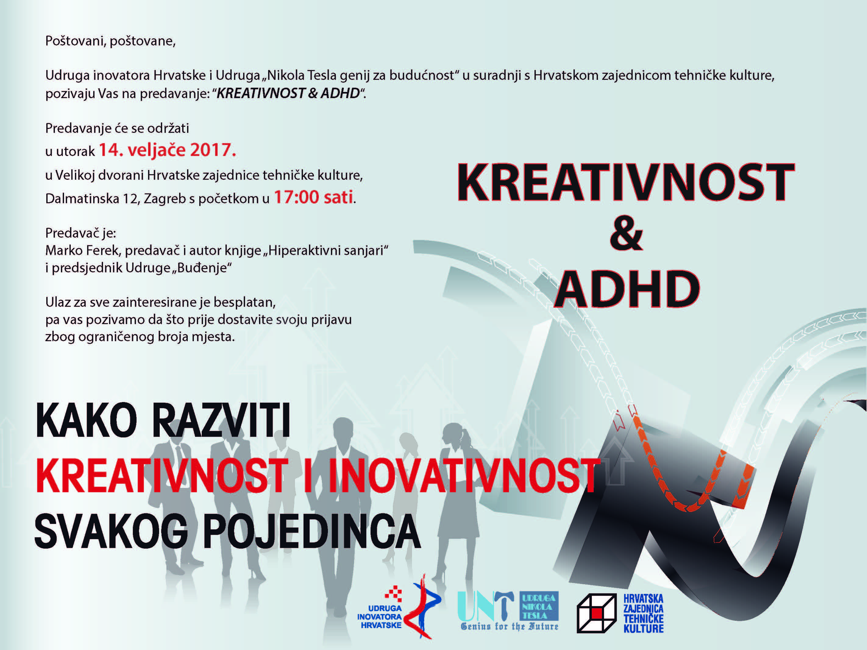 Prvo predavanje u 2017. godini iz ciklusa predavanja koje organiziraju Udruga Nikola Tesla – genij za budućnost i Udruga inovatora Hrvatske u suradnji s Hrvatskom zajednicom tehničke kulture s ciljem poticanja kreativnosti i inovativnosti kod osoba svih životnih dobi u sklopu projekta „Kako razviti kreativnost i inovativnost svakog pojedinca“.