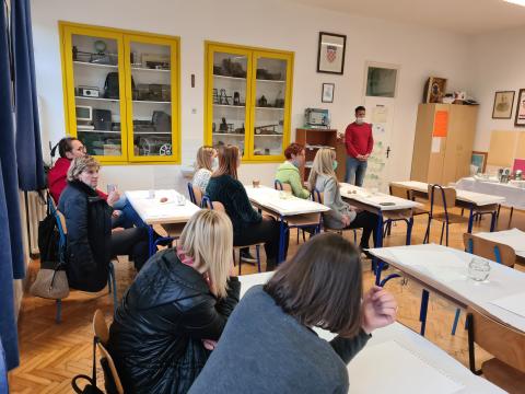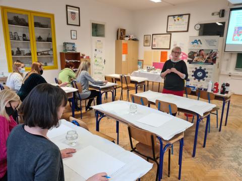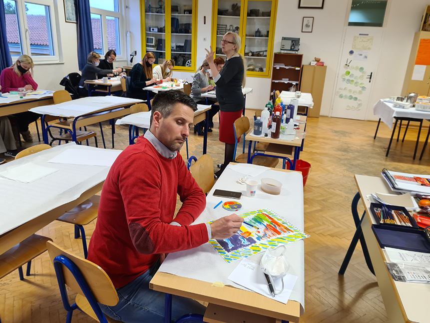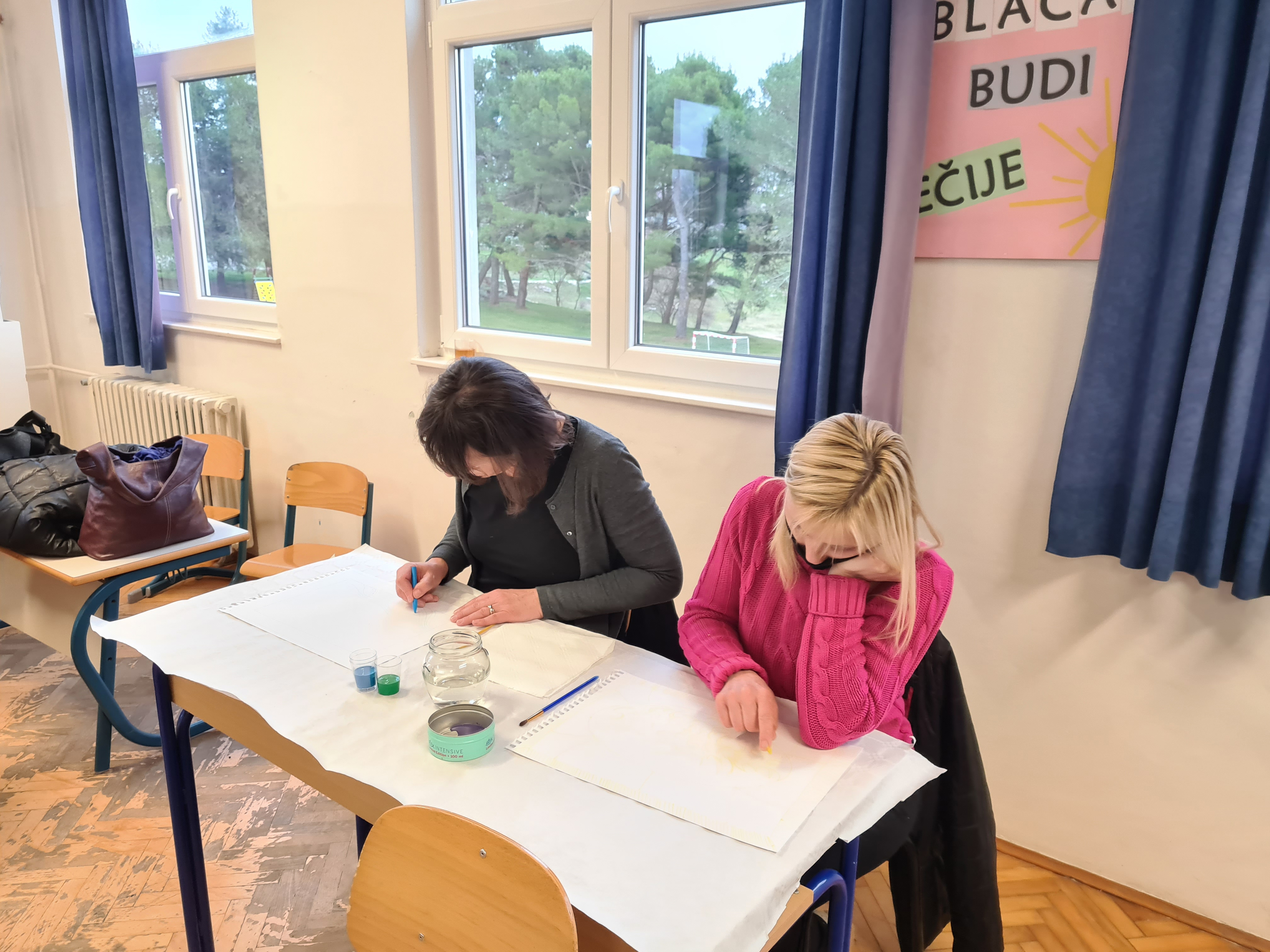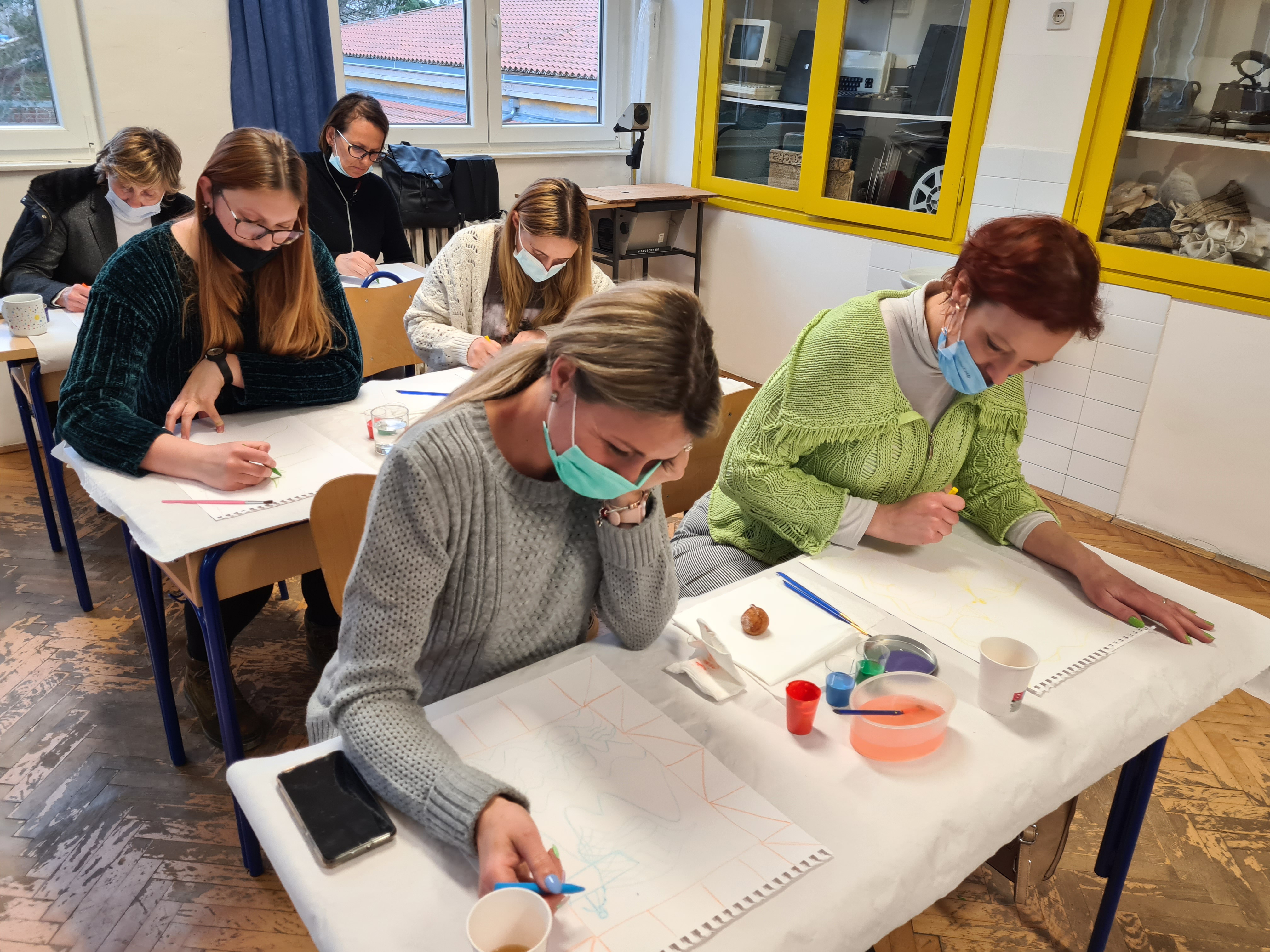 Učitelji su tijekom rada vrlo kratko ponovili temeljne pojmove likovnoga jezika, a upoznati su i s osnovnim načelima likovne terapije koja u kombinaciji s edukacijskom rehabilitacijom može poticati cjelovit razvoj svih učenika i pozitivno djelovati na odgojno-obrazovne procese.