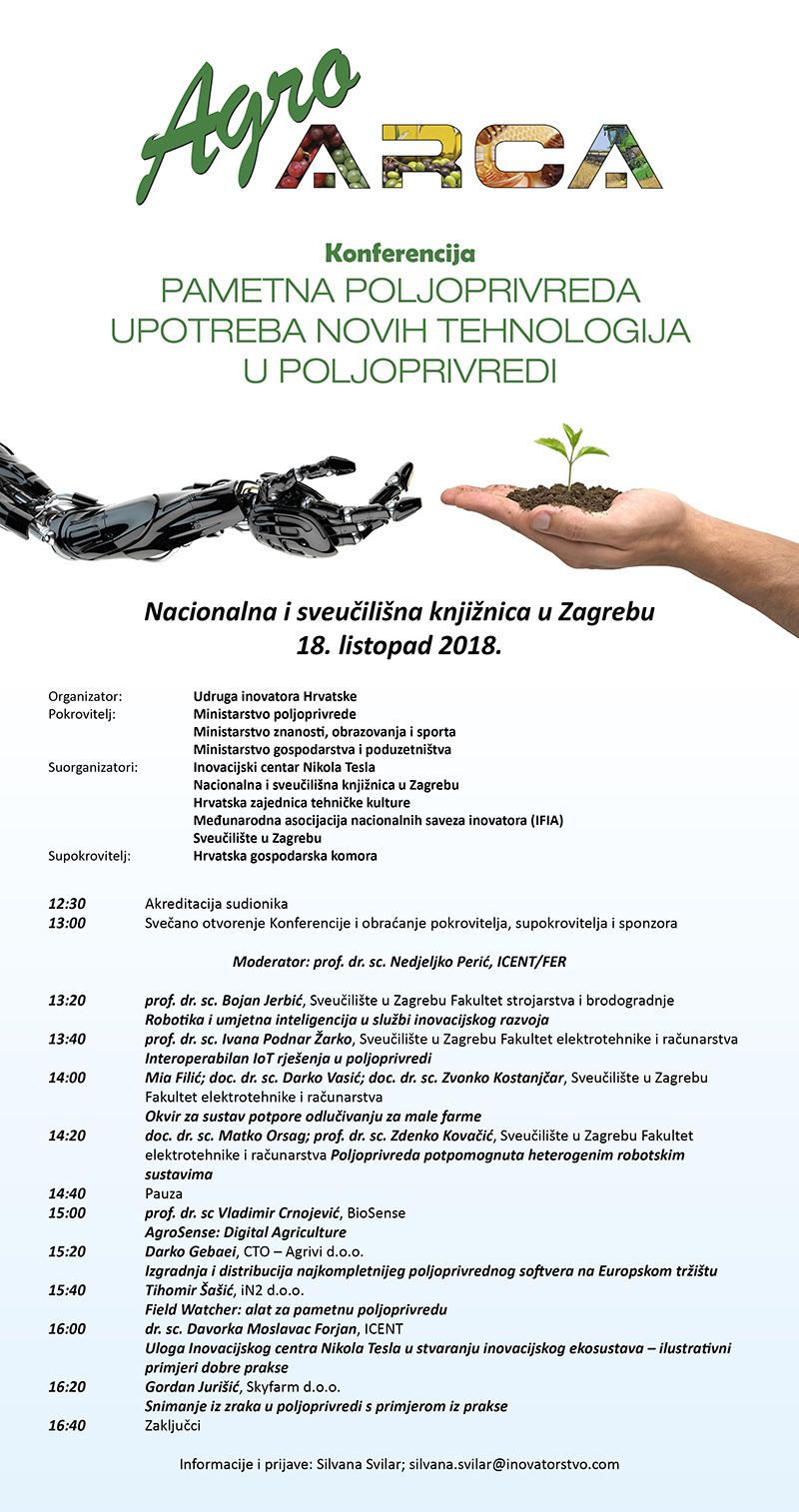 Udruga inovatora Hrvatske zajedno sa suorganizatorima, Inovacijskim centrom Nikola Tesla, Sveučilištem u Zagrebu, Nacionalnom i sveučilišnom knjižnicom u Zagrebu, Hrvatskom zajednicom tehničke kulture i Međunarodnom federacijom nacionalnih saveza inovatora IFIA poziva vas 18. listopada ove godine u 13:00 sati na konferenciju Pametna poljoprivreda – upotreba novih tehnologija u poljoprivredi u Nacionalnu i sveučilišnu knjižnicu u Zagrebu.